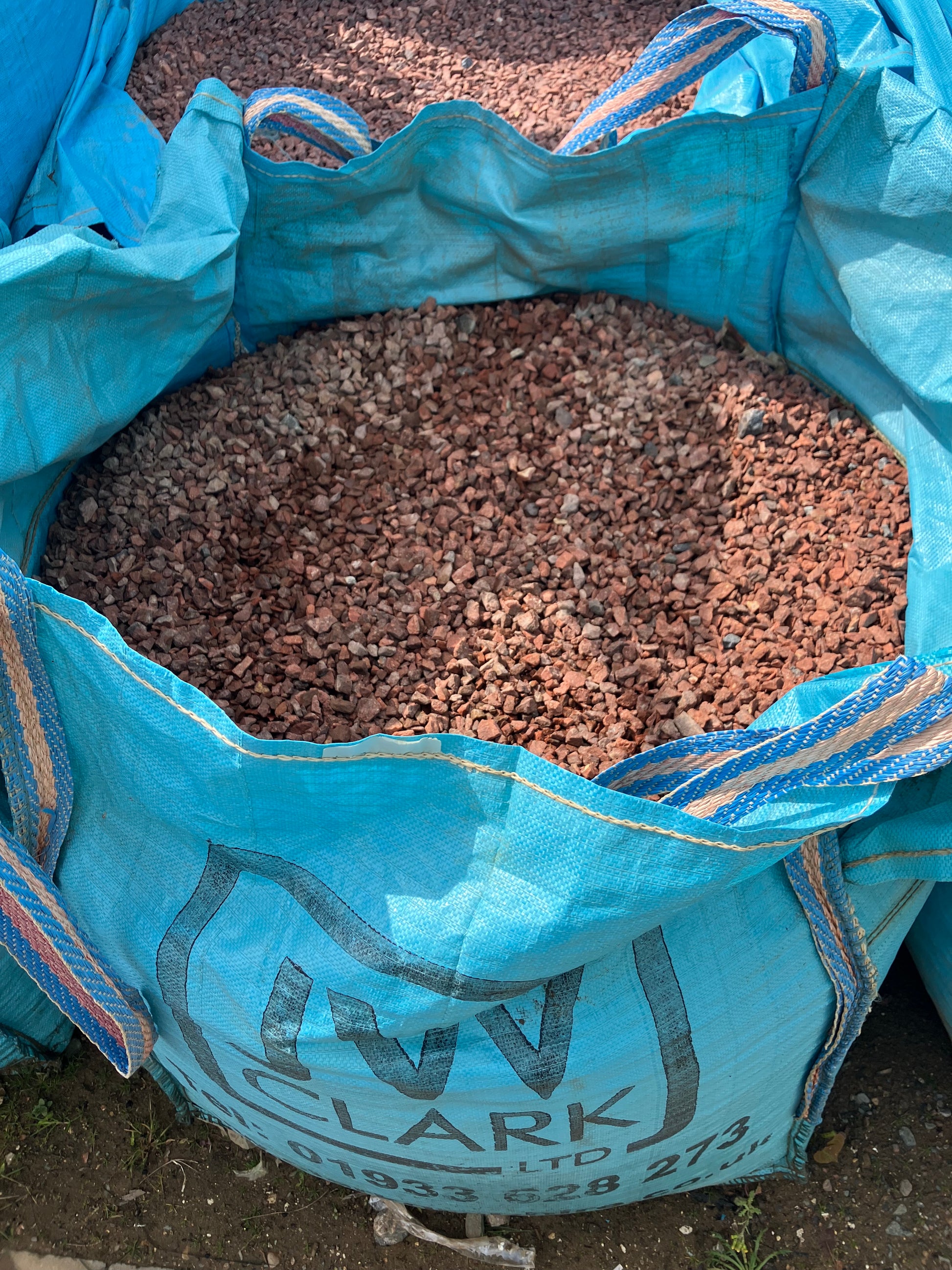 Deep Red Stone Chippings Lovely red chippings, angular in shape and ideal for all pedestrian and garden projects, can also be used for driveway areas. Lovely when used as a pathway between paved areas, a good match up against most colours of block paving and slabs, particularly up against blue paving. And also looks good at the bottom of a red brick wall.