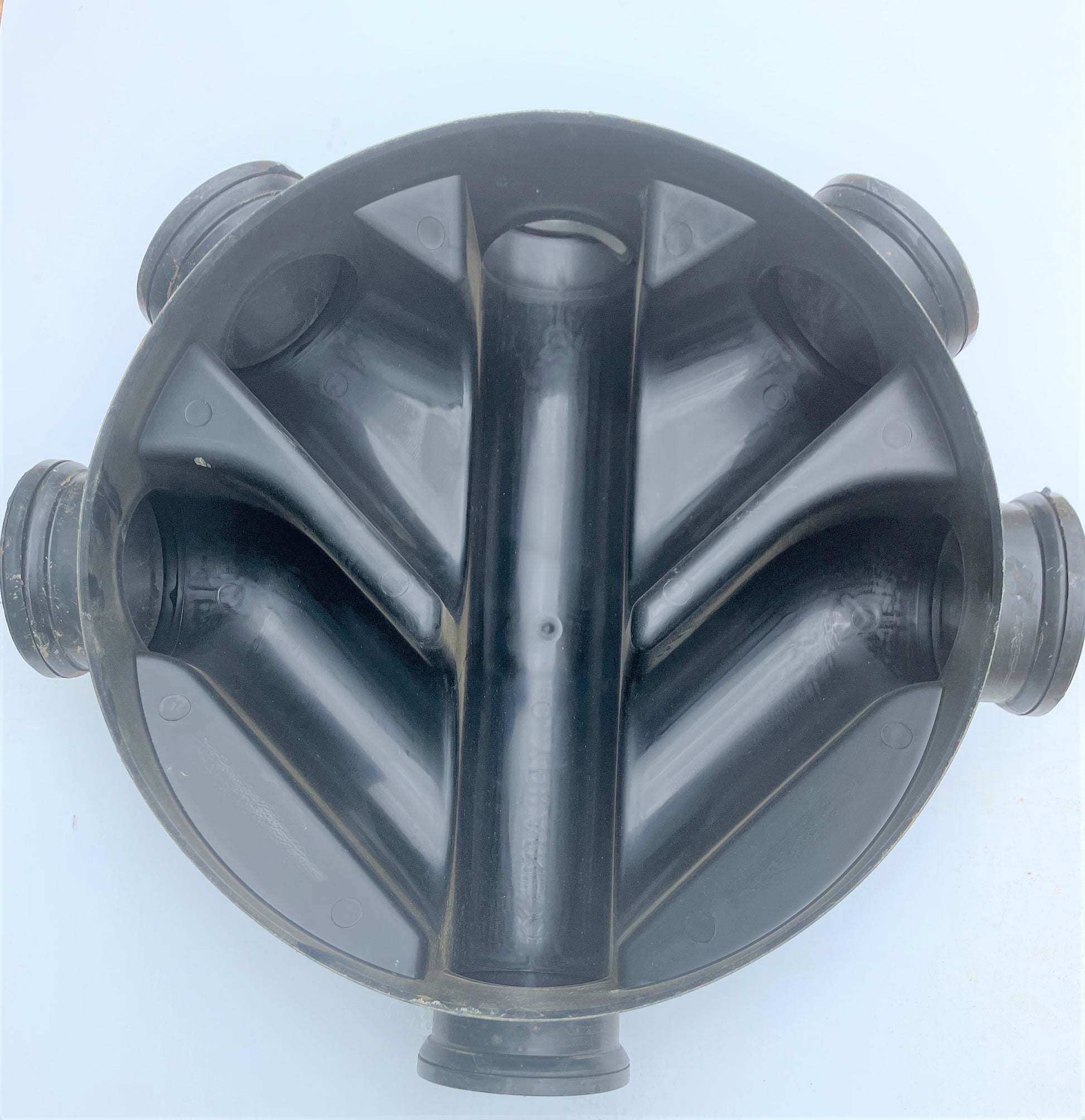 Large manhole base 450mm. Comes with 2 inlets on each side, total of 4. Two inlets are at 90 degrees to the channel, the other two at 45 degrees. With blanking plugs fitted on the four inlets.