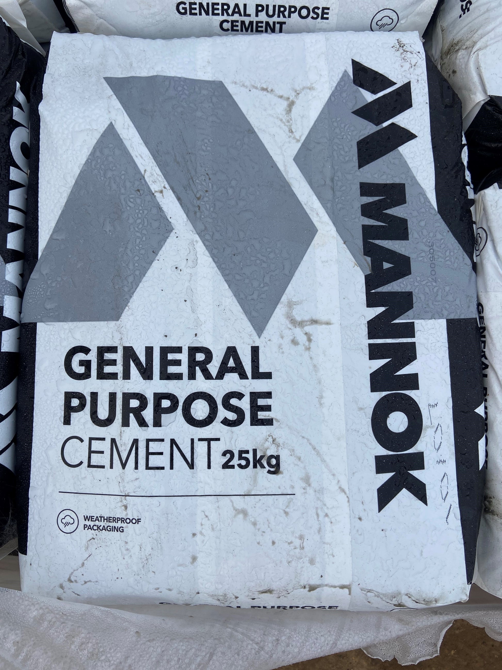 Mannok General Purpose cement. 25kg in tough plastic, waterproof packaging, ideal for mixing with all manner of aggregates such as building sand, sharp sand, ballast etc. Ideal for pointing and jointing etc.